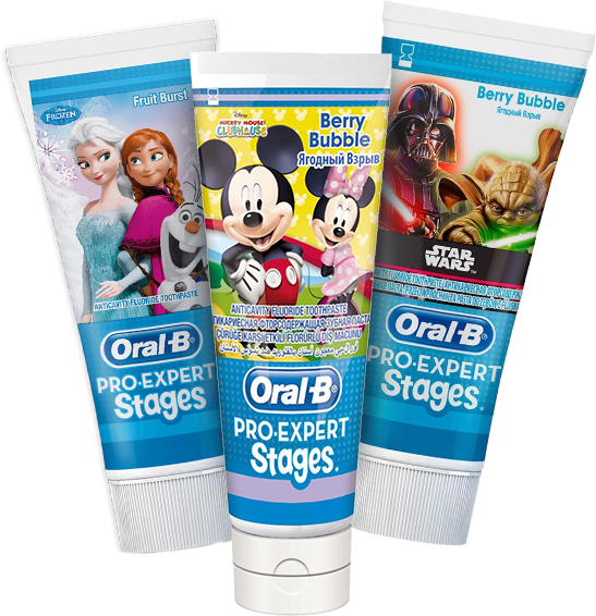 Сейчас есть очень много детских зубных паст на любой вкус и цвет, например, пасты Oral-B Pro-Expert Stages «Ягодный взрыв» и «Фруктовый взрыв» с героями диснеевских мультфильмов и «Звездных войн», которые можно использовать в комплекте с щетками Oral-B Stages Power в аналогичном дизайне и с детским обучающим приложением для смартфонов Magic Timer.